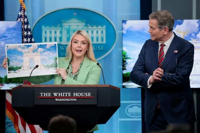 En su rueda de prensa semanal, la portavoz de la Casa Blanca, Karoline Leavitt, mostró una imagen renderizada del proyecto, que tendrá 250 pies de altura (76.2 metros) por cada uno de los 250 años de Estados Unidos, coronado por una figura de la victoria alada y flanqueado en su base por leones dorados.