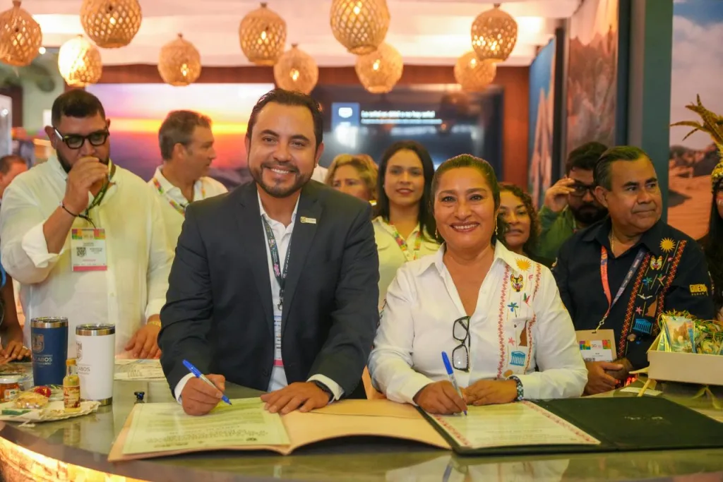 En el segundo día de actividades de la edición 50 del Tianguis Turístico, la alcaldesa Abelina López Rodríguez participó en la firma de cartas de amistad y convenios de colaboración con representantes del sector transporte y autoridades de distintos destinos del país, acciones que fortalecen la conectividad terrestre y la proyección turística del puerto.
