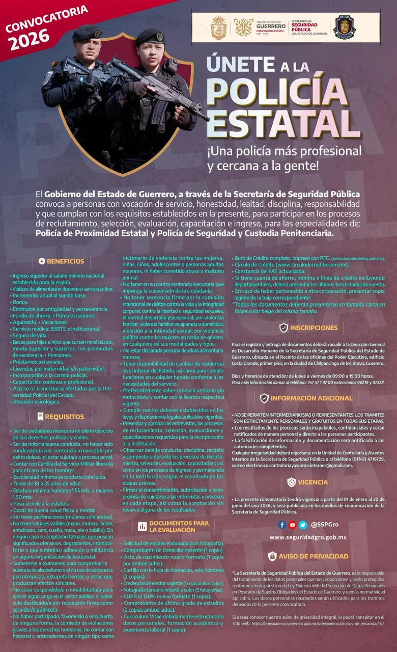 La Secretaría de Seguridad Pública abrió su proceso de reclutamiento para Policía de Proximidad Estatal y Policía de Seguridad y Custodia Penitenciaria, dirigido a personas interesadas en incorporarse a sus filas, como parte de las acciones para fortalecer la seguridad en la entidad.
